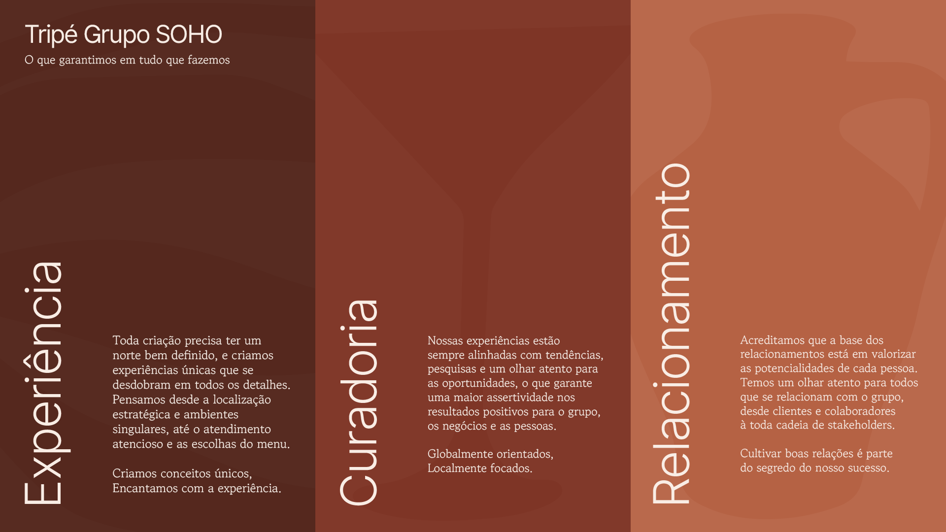 Nosso desafio foi criar uma marca capaz de elevar o Grupo Soho além de um portfólio de casas e experiências, posicionando-o como um curador cultural e símbolo de excelência em hospitalidade. A partir desse objetivo, estruturamos um tripé estratégico que orienta o grupo em sua expansão e na criação de novas marcas e serviços.