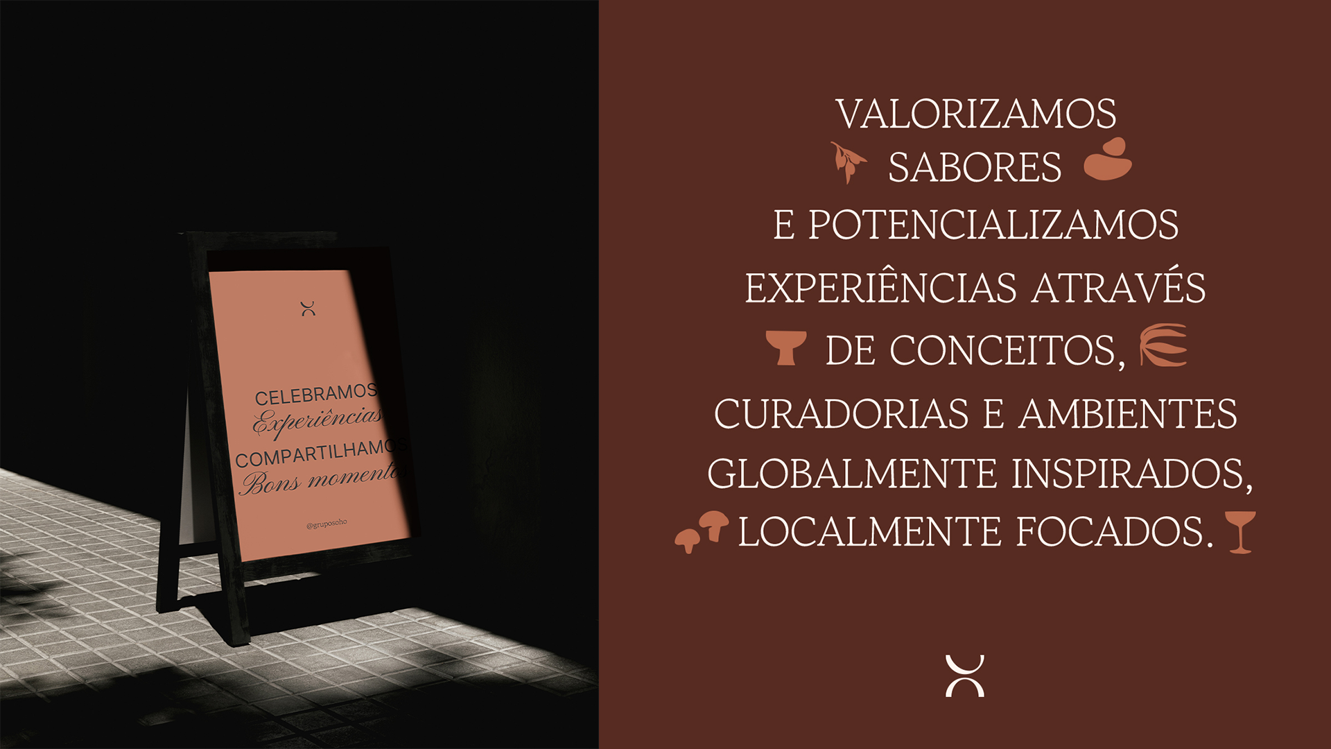 Os tons terrosos, a tipografia elegante e a composição minimalista reforçam a sensação de acolhimento e refinamento, enquanto a estrutura modular e adaptável traduz o ecossistema dinâmico e em expansão do grupo.